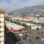 Balkong med åpen utsikt over byen og Elola fotballstadion.